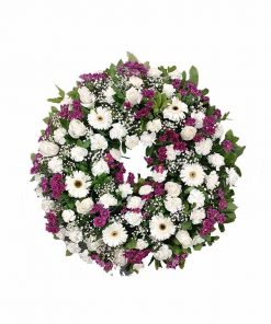 Su diferente color morado que adereza al resto de flores resulta un arreglo floral fúnebre super original, único y diferente para enviar al tanatorio, cementerio o entierro hoy mismo.