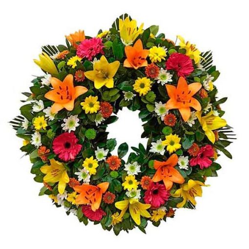 La colorida y original corona funeraria para difuntos Primavera está elaborada con flores naturales frescas y con un gusto sobresaliente.